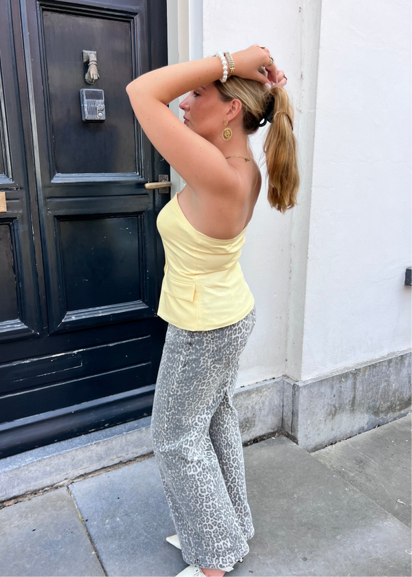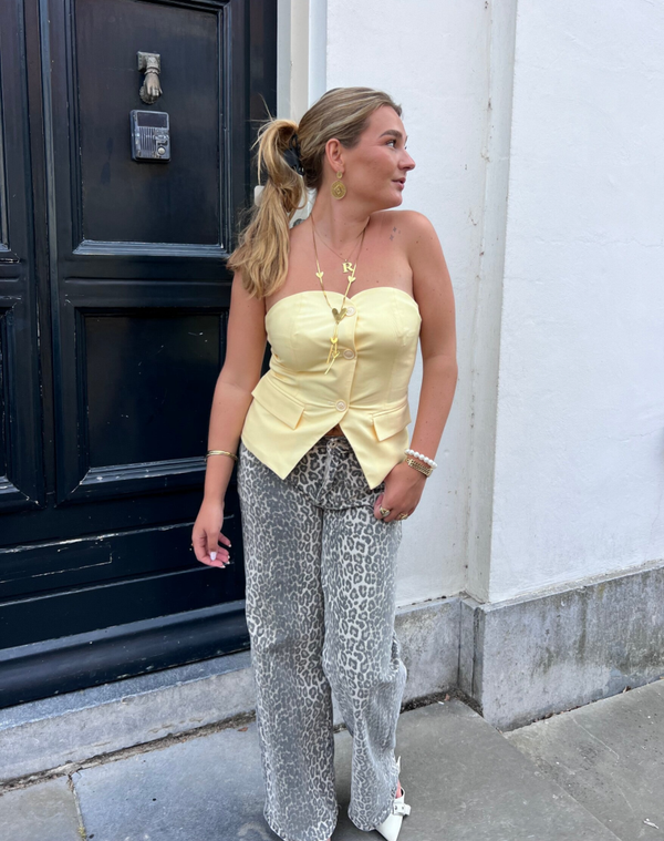 Deze prachtige bandeau top in lichtgele kleur is dubbelgevoerd en heeft prachtige knopen. Draag boven onze leopard jeans.. de champagne spring short of basic met een denim jeans en je straalt direct!