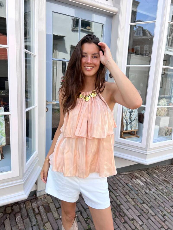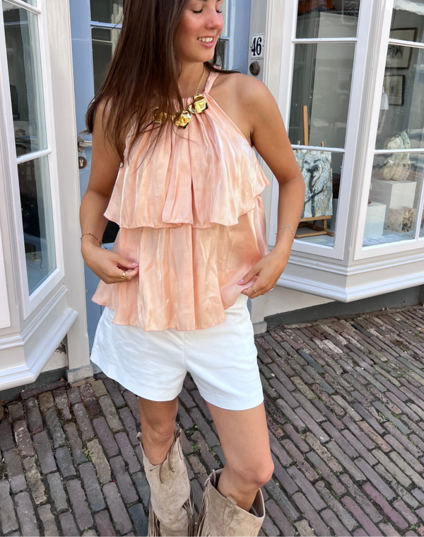 De luna satin ruffle top is dé perfecte top met de prachtige pasvorm van de viral jurkjes. De haltertop met speelse lagen en glanzende look maakt het een echte eyecatcher en musthave voor feestjes of date nights.