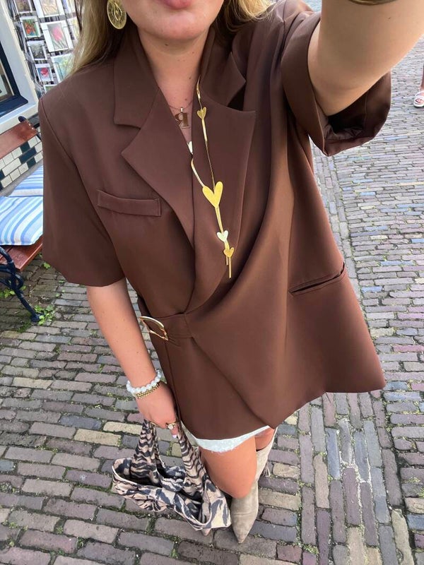Deze dubbelgevoerde blazer met korte mouwen en oversized fit straalt pure klasse uit. Het ceintuur met gouden gespdetail en de schoudervullingen zorgen voor een krachtige, elegante look. Perfect om zowel chic als casual te dragen – een echte statement piece!