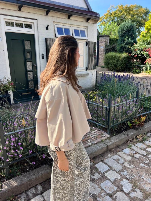 Het korte model trenchcoat met cape-effect geeft een moderne look, terwijl de bruine knopen en stijlvolle gespjes bij de mouwen zorgen voor verfijnde details. One size en eindeloos te stylen, een echte statement piece voor iedere garderobe.