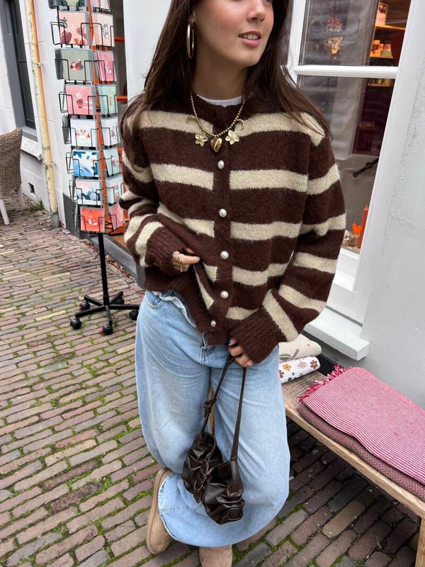 Het aurora vest is een gebreid, superzacht en heerlijk warme knit dat comfort en stijl combineert. Met leuke parel detail knopen!! Het vest is one sized en te dragen met maat XS t/m L/XL. Qua pasvorm hetzelfde als de isabella vestjes, maar deze heeft dikkere strepen!