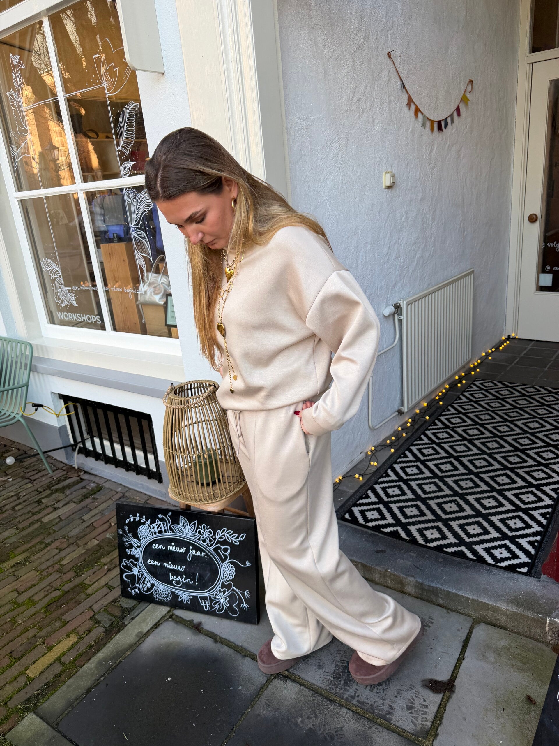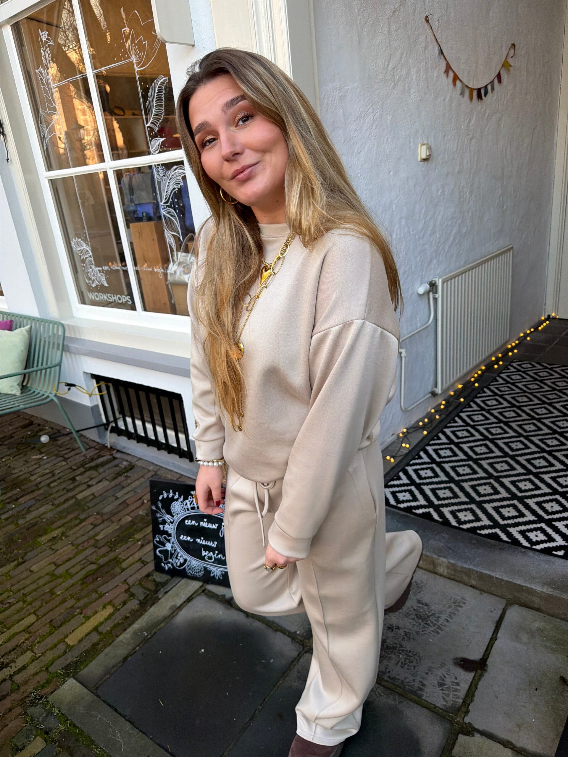 Het bestaat uit een zachte, ruime sweater en een wijde jogger met een subtiele bies, wat het geheel een kleine touch/ chique uitstraling geeft.