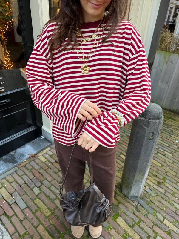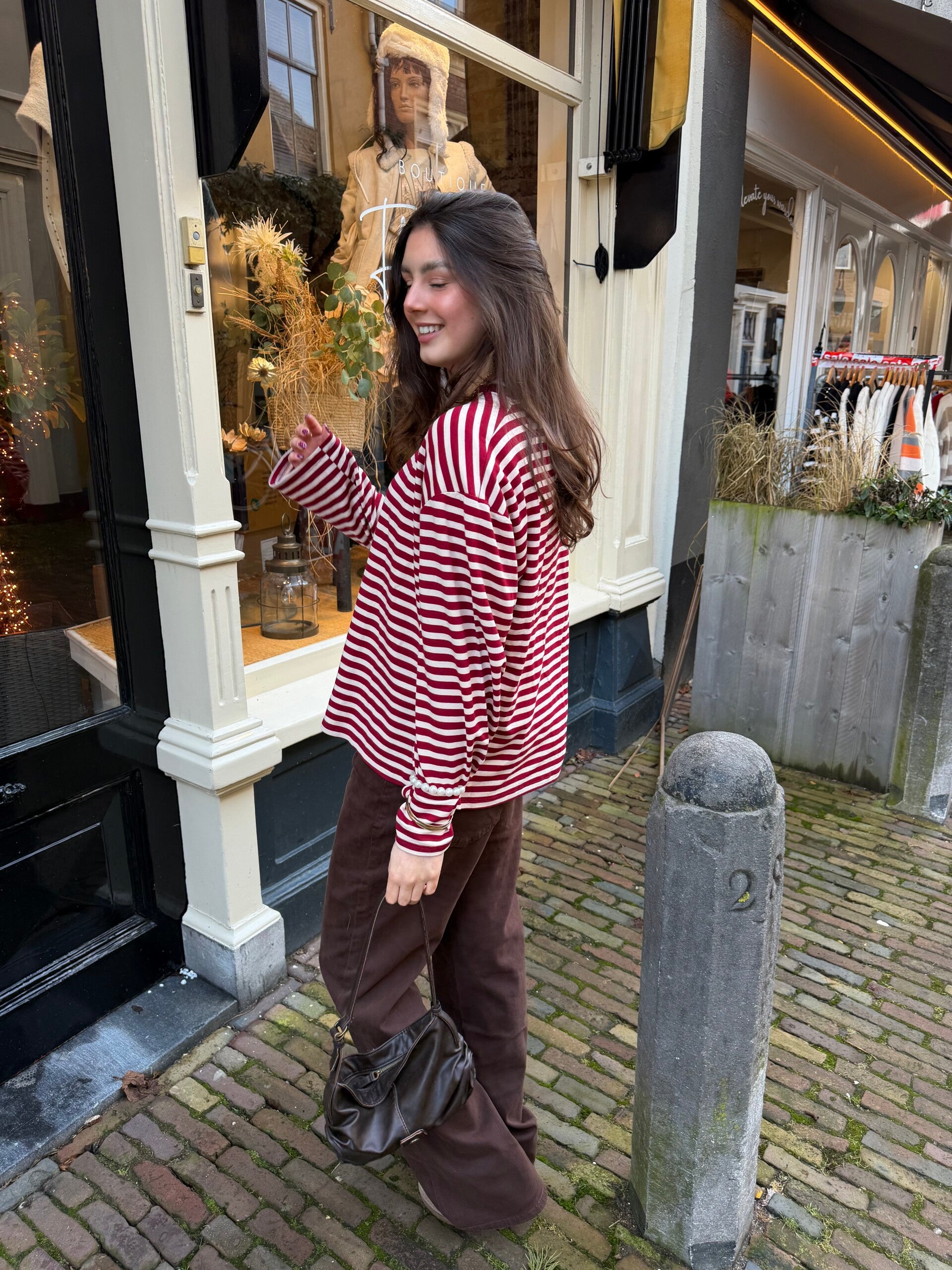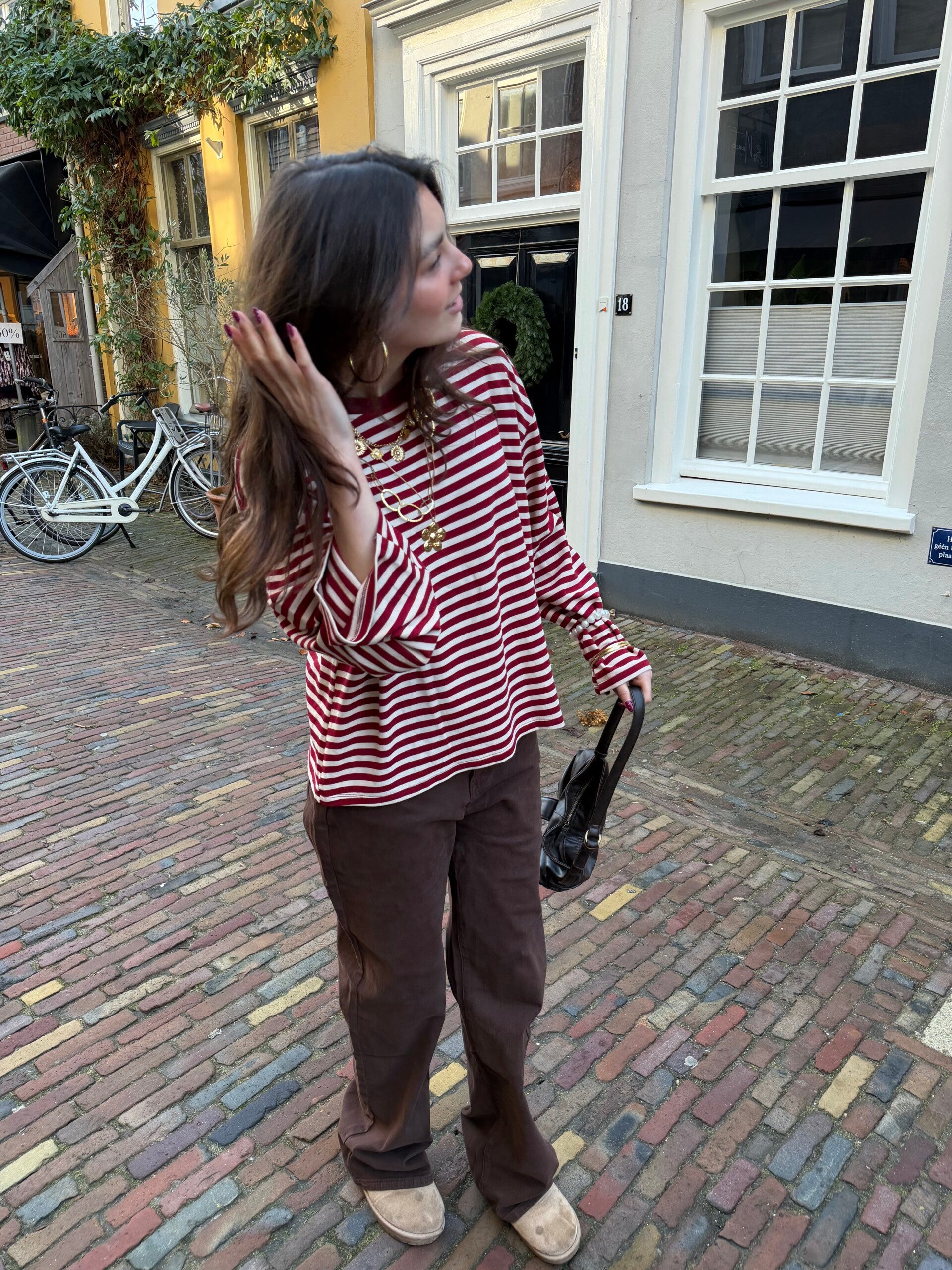 De top/longsleeve is gemaakt van een katoen, heeft bruin/ gele strepen, een ruime, oversized pasvorm, een ronde hals en wijde mouwen! Te dragen met maat S t/m L/XL voor de juiste fitting. Super leuk te combineren met de bruine saar pants!