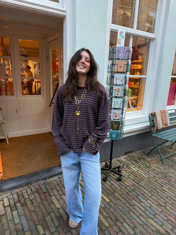 De top/longsleeve is gemaakt van een katoen, heeft bruin/ gele strepen, een ruime, oversized pasvorm, een ronde hals en wijde mouwen! Te dragen met maat S t/m L/XL voor de juiste fitting. Super leuk te combineren met de bruine saar pants!