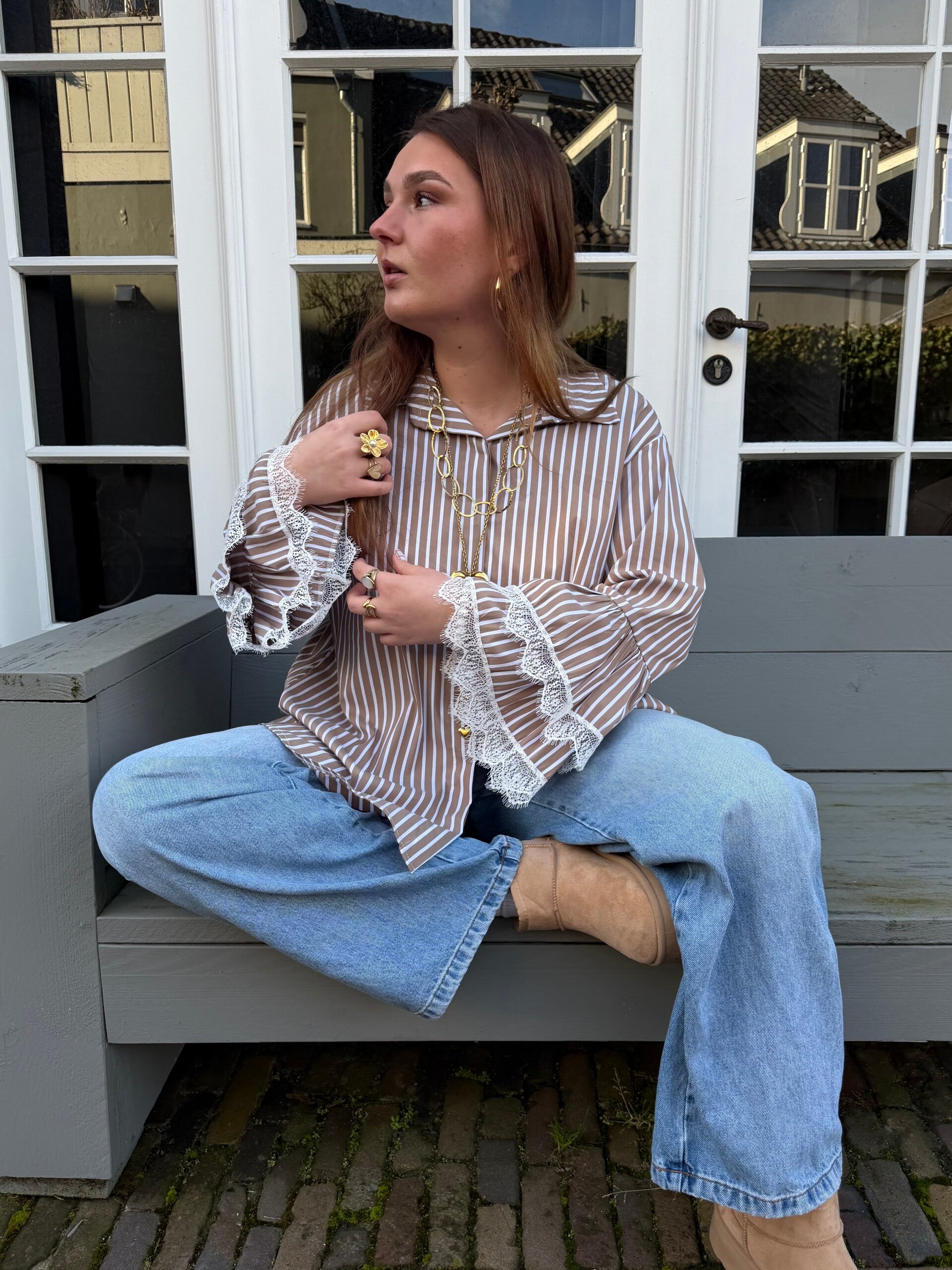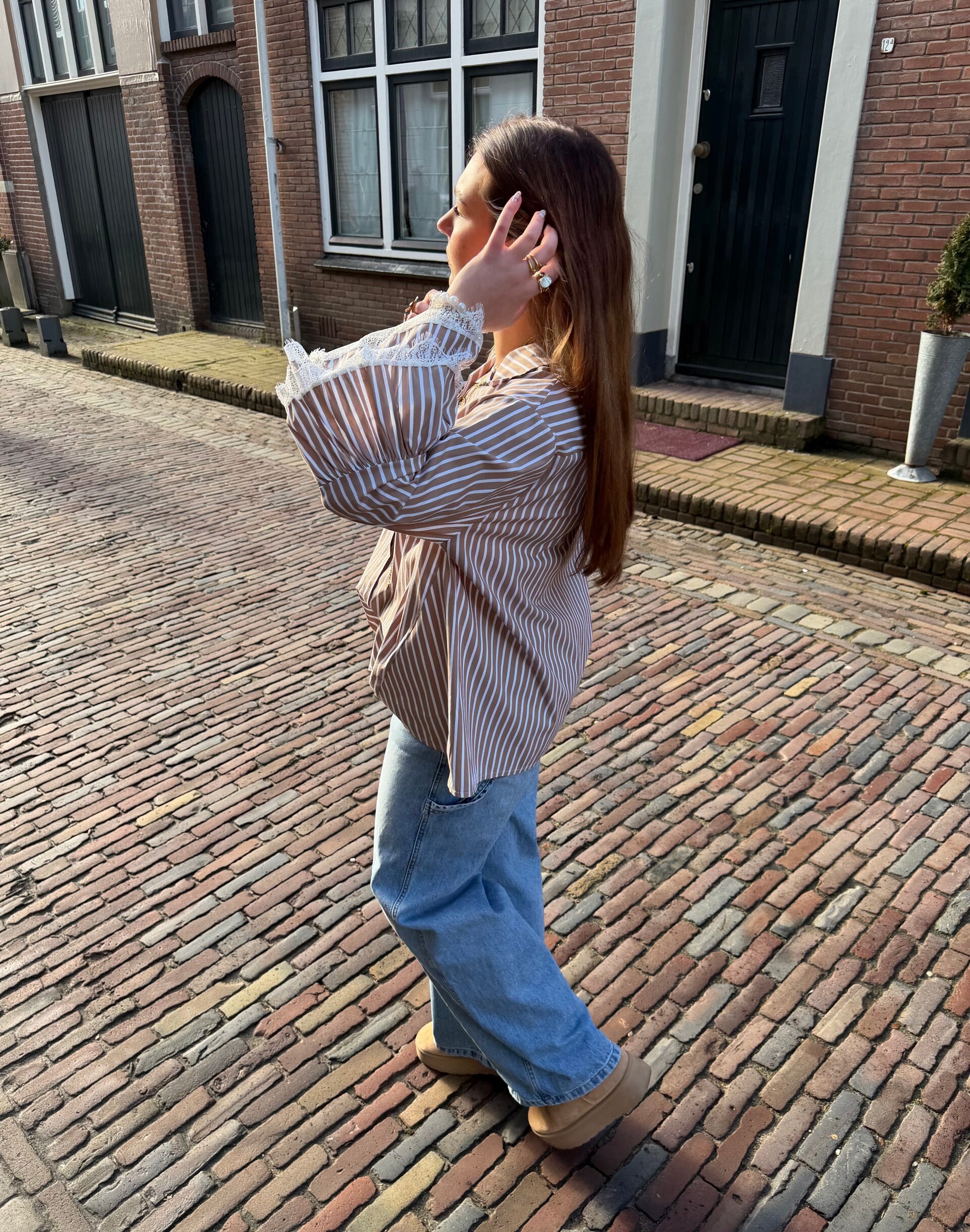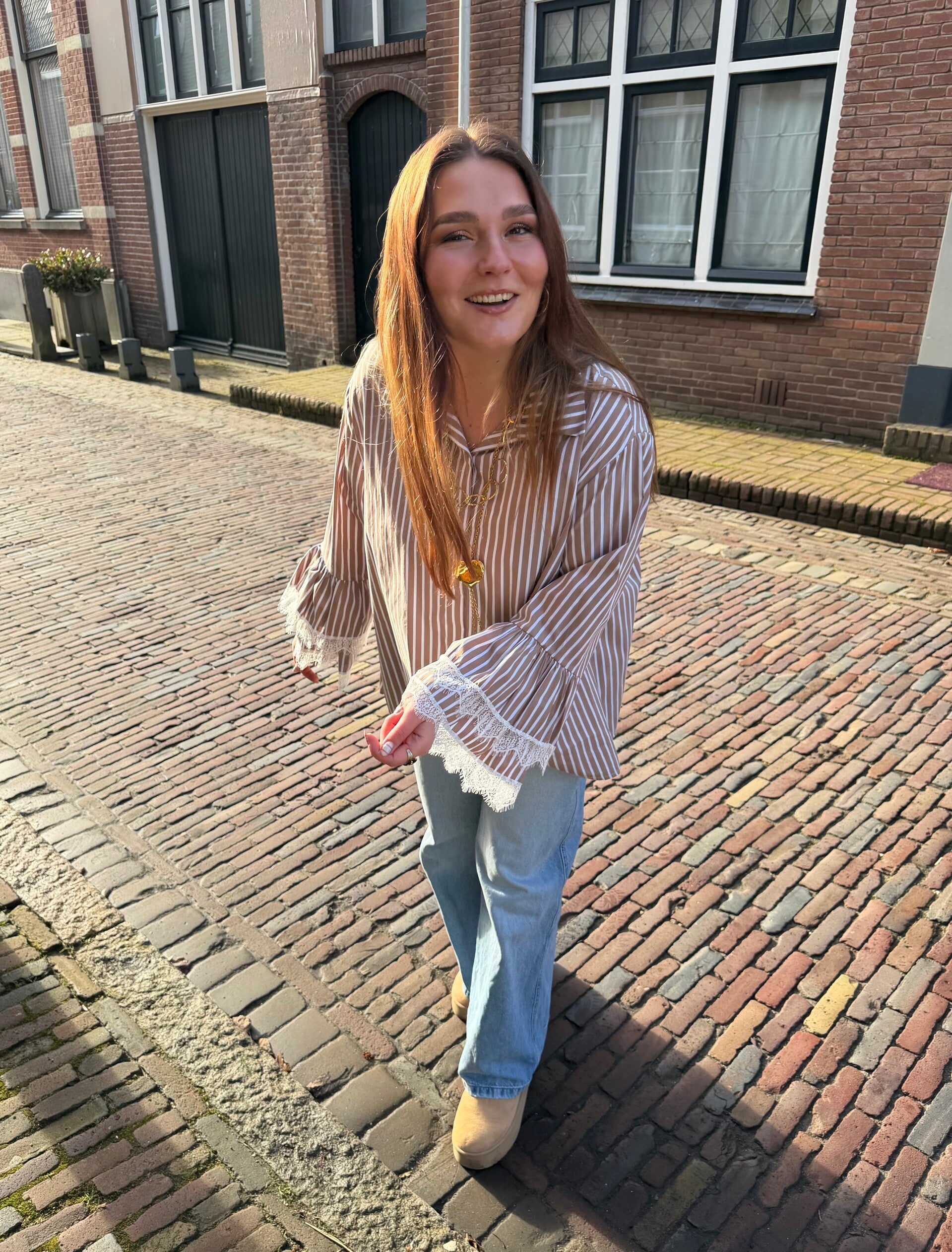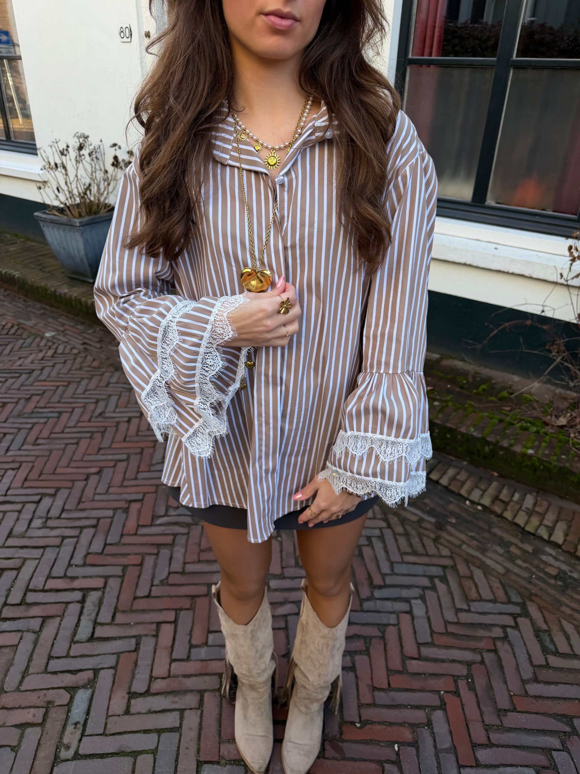 De frankie striped blouse is een one sized luchtige, losvallende blouse met speelse wijd uitlopende mouwen en kanten details.